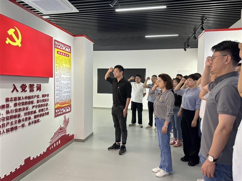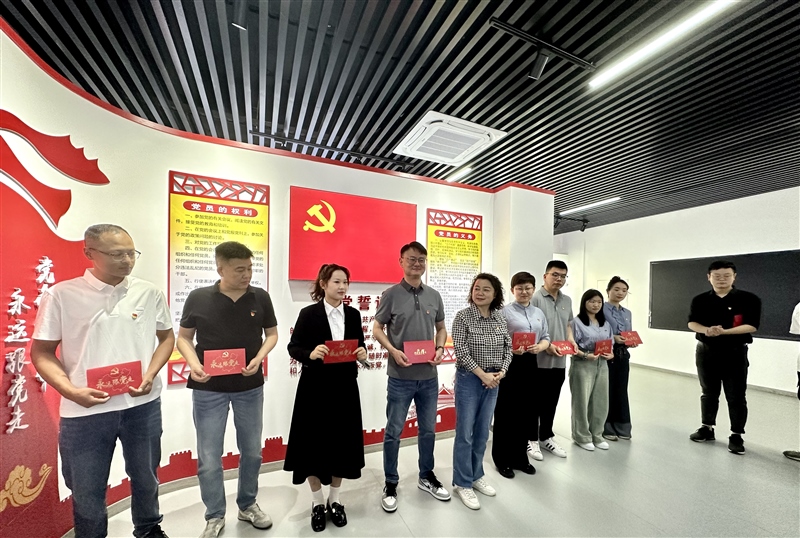 會前,集團黨建園地內(nèi),董事長楊靜帶領(lǐng)全體黨員重溫入黨誓詞,為上半年過政治生日的同志贈送政治生日賀卡。