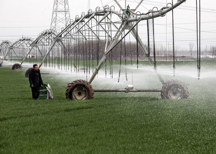 村民使用全自動指針式噴灌機(jī)進(jìn)行澆灌作業(yè)。新華社發(fā)(程全攝)