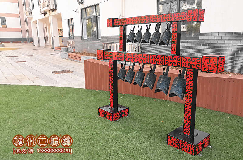 編鐘外形按照曾侯乙編鐘制作,青銅鑄造;采用標準音高A=440Hz調音,要求聲音清脆悅耳,有延續(xù)音,無啞音編鐘,半音齊備,音位表詳見設計圖,編鐘采用雙層設計,下層懸掛6件甬鐘,上層懸掛5件甬鐘。編鐘大梁采用鋼結構焊接制作,表面噴漆,彩繪花紋,設計詳見合同附件。配套演奏工具1套、樂譜1套。